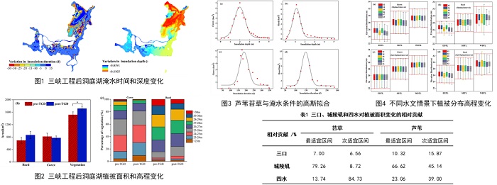 针对这一科学问题,中国科学院亚热带农业生态研究所谢永宏研究员团队基于长期水文观测数据、遥感影像解译和MIKE 21水动力模型模拟,对比分析了三峡大坝运行前后洞庭湖淹水格局与植被格局的时空演变特征,并通过设置多种水文情景,首次量化了湖泊入水口与出水口水文条件对植被变化的贡献。结果表明:(1)三峡大坝运行后,三口年均径流和城陵矶年均水位均显著下降,且两者的年内变化特征在大坝运行前后存在差异,其中7-12月较大坝运行前减少,而1-3月增加;(2)洞庭湖平均淹水时间减少9天,平均淹水深度降低0.25米,其中东洞庭湖变化最为显著;(3)植被面积扩大并向湖心移动,其中芦苇面积增加且分布高程明显下移,挤占苔草空间;(4)苔草和芦苇适宜的淹水时间分别为132–240天和110–186天,表明芦苇在水位减少条件下竞争优势更强;(5)城陵矶出水口水位下降是洞庭湖植被演替的主要驱动因素,对比三口四水,城陵矶水文条件对苔草和芦苇最适宜生长面积的贡献分别为79.26 %和66.62 %。